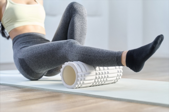 • 床に座り、ふくらはぎの下にフォームローラーを置く