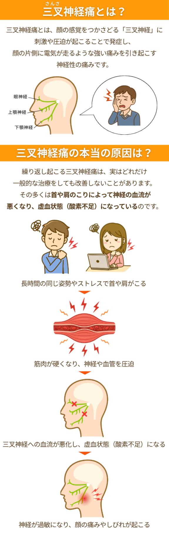 一般的には「血管が神経を圧迫していること」が原因とされていますが、実際には、首や肩のこりによって神経の血流が悪化し、三叉神経が虚血(酸素不足)状態になることが大きな原因です。