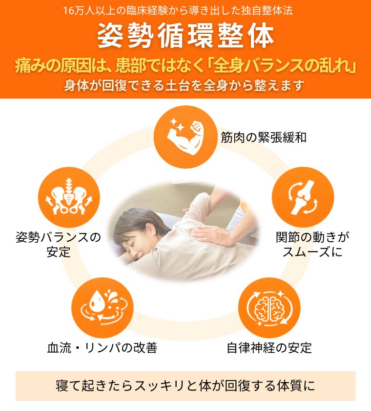 その結果、痛みの出ている部分だけをケアしても、姿勢や全身バランスが変わらなければ再発しやすい状態のままになります。