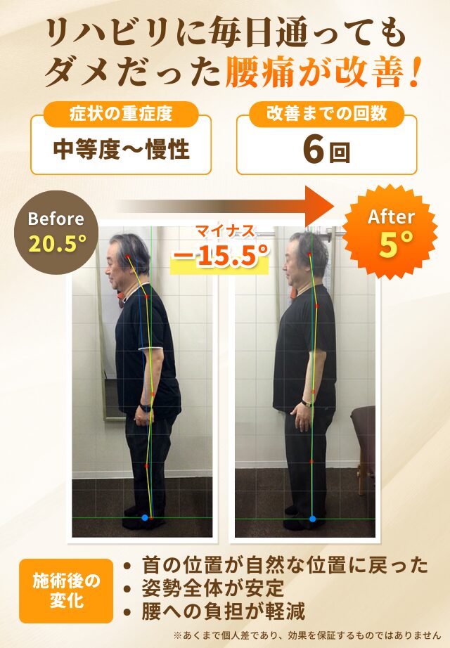 首の角度が変わり、頭の位置が良くなることにより腰にかかる負担が減っていることがわかるかと思います。