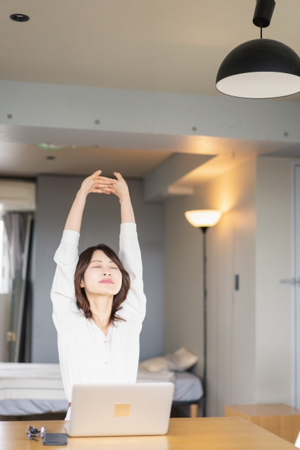 デスクワークの途中で肩のストレッチをする女性